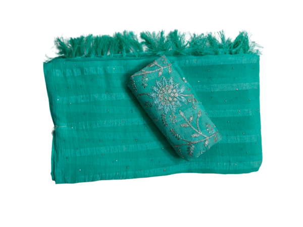 Step into timeless elegance with this Chinon Silk Saree, beautifully crafted with intricate Aari embroidery that reflects traditional artistry at its finest. The lightweight, flowy silk drapes gracefully, while delicate mirror and sequin embellishments add just the right touch of shimmer, making it perfect for weddings, festive occasions, or grand celebrations. A true blend of sophistication and charm, this saree is designed to make you stand out effortlessly.