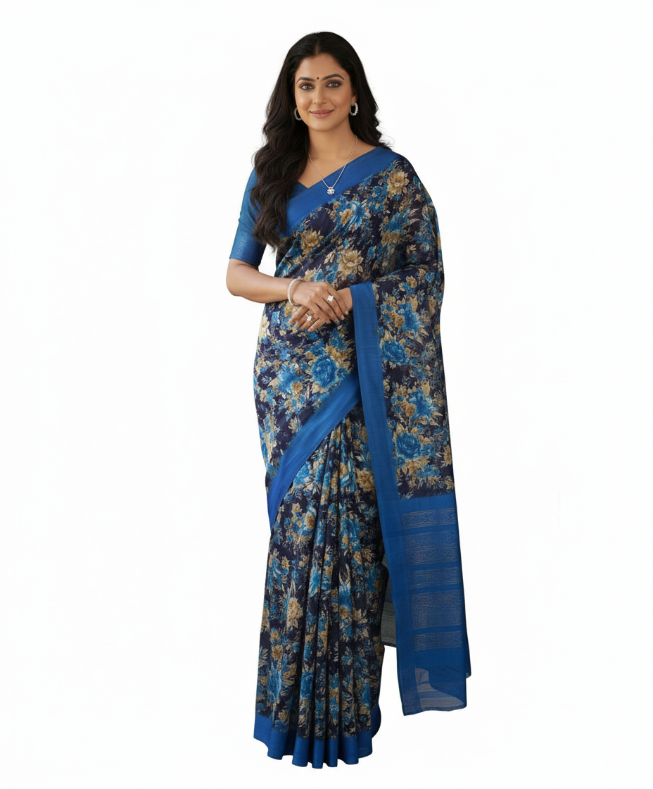 Elevate your style with this premium blue floral printed fabric, designed with delicate golden accents on a deep dark base. The fabric features a striking solid blue border that adds contrast and elegance, making it a versatile choice for sarees, kurtis, salwar suits, dresses, and festive wear. Crafted from high-quality material, it is soft, durable, and perfect for creating both ethnic and contemporary outfits.