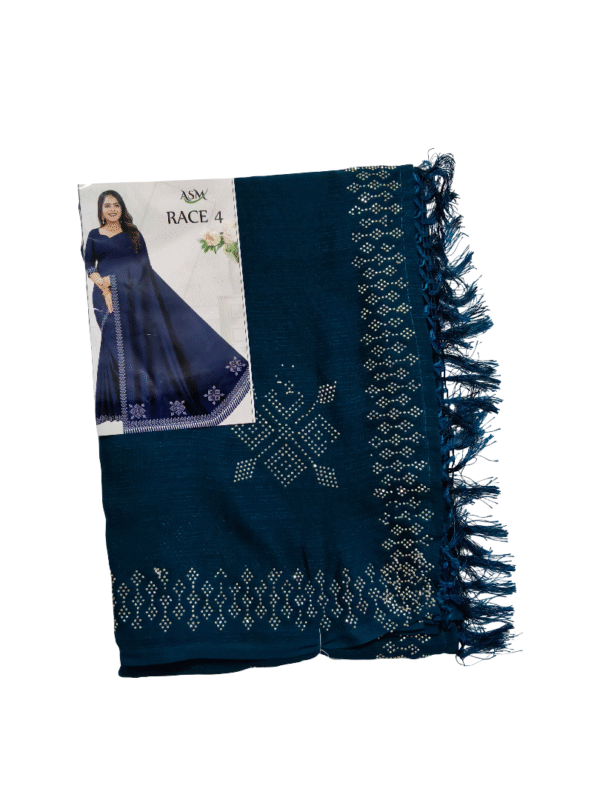 Discover timeless elegance with this ASM Race 4 designer saree in dark teal/navy blue. Crafted from a smooth satin-like fabric, it features a luxurious sheen and graceful drape. The saree is embellished with sparkling stones and beads, forming intricate geometric patterns along the borders and pallu. A striking central motif enhances the body design, while the tasseled pallu adds a stylish finishing touch. Perfect for weddings, festive occasions, and evening parties, this saree beautifully blends tradition with contemporary charm.
