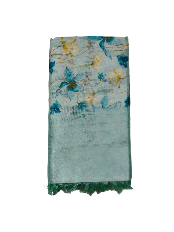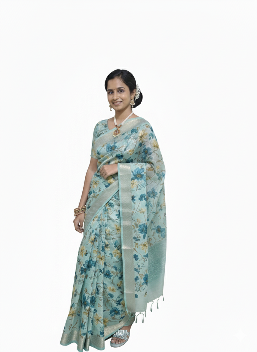 This Garden Vareli Nara Chiffon Saree is a perfect blend of comfort and elegance. Made from soft, lightweight Nara Chiffon, it drapes beautifully while keeping you at ease. The saree is adorned with a digital floral print featuring blue and yellow blossoms on a soothing light blue or white base, creating a fresh and graceful look. The aqua green border with subtle textured detailing adds a refined touch, while green tassels on the pallu complete the design with charm. Ideal for casual wear, festive occasions, or daytime gatherings, this saree is a stylish addition to any wardrobe.